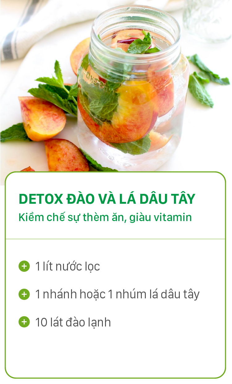 Vào mùa hè thì đây cũng là loại nước vừa giúp bạn giảm cân, vừa giúp giải nhiệt, làm mát cơ thể hiệu quả. Đặc biệt, lá dâu tây có thể kiềm chế cơn thèm ăn trong ngày. Còn đào lại có vị ngọt tự nhiên nên rất hài hòa khi kết hợp cùng lá dâu tây.